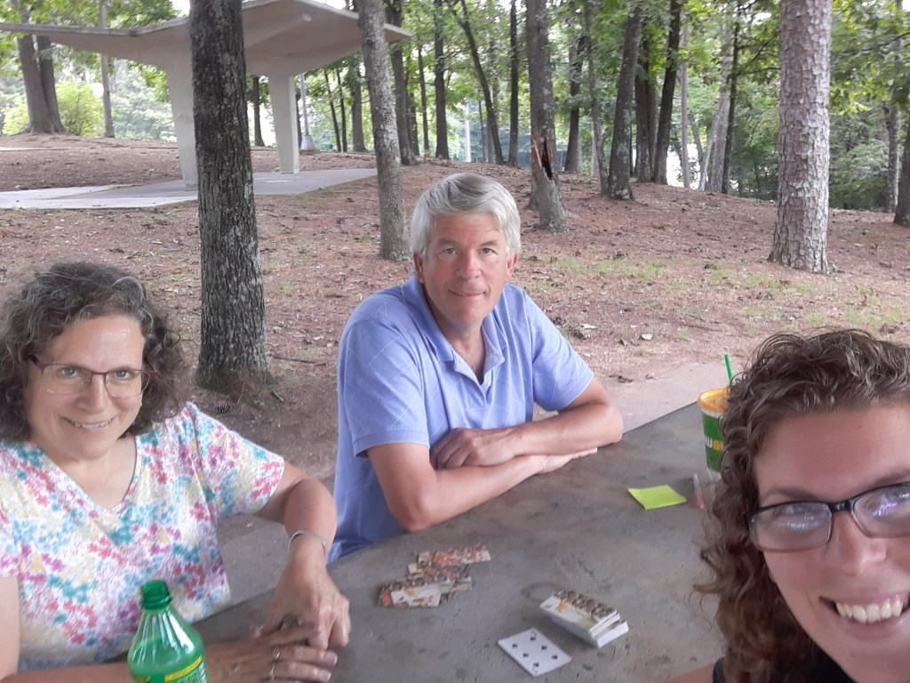 Some of you may be gasping in horror, but Iβve learned, sometimes, itβs about the journey itself! The second day, at one of our rest-stop breaks, the georgous trees and smooth cement top picnic tables prompted the procuring of Bananagramsβ¦ followed by our favorite Rummy game played with two decks of cards. Like I saidβ¦ true Galloway fashion!