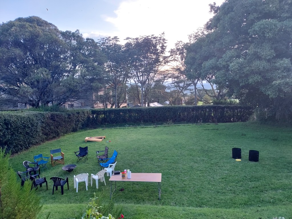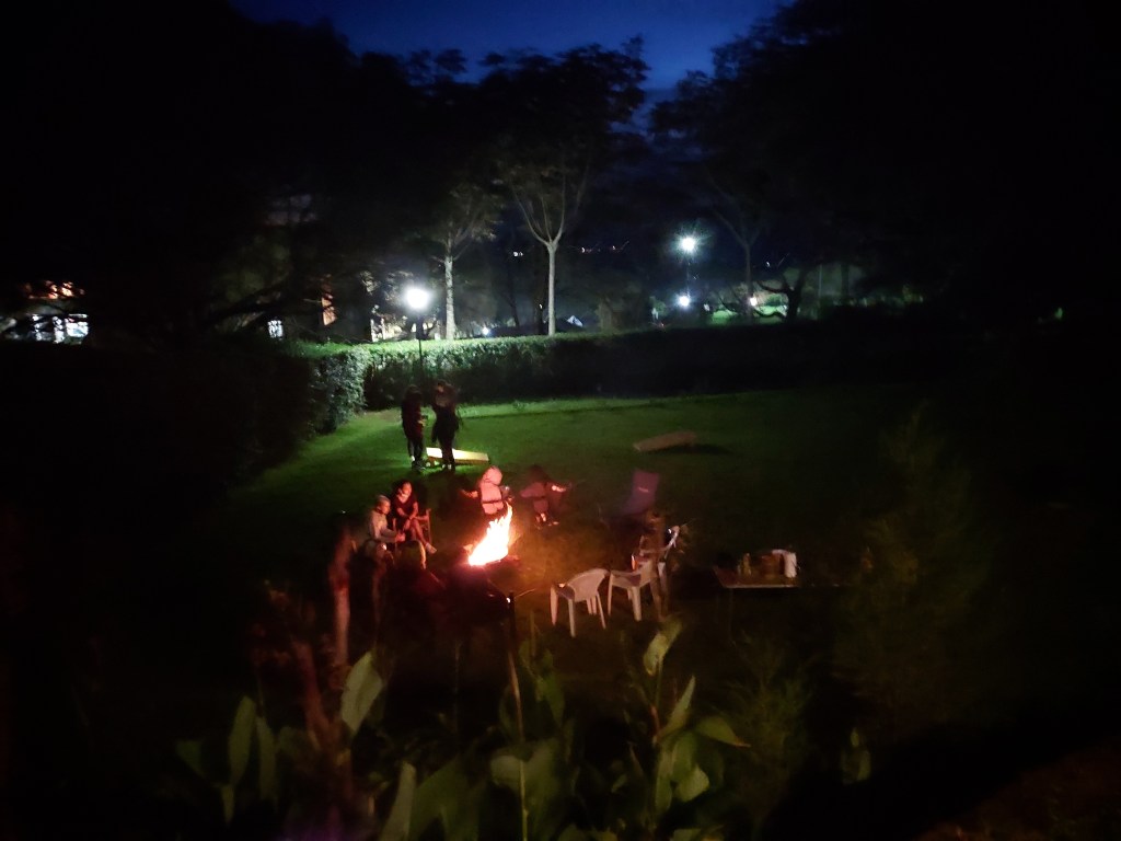 Hosting yard games and a bonfire where marshmallows fell