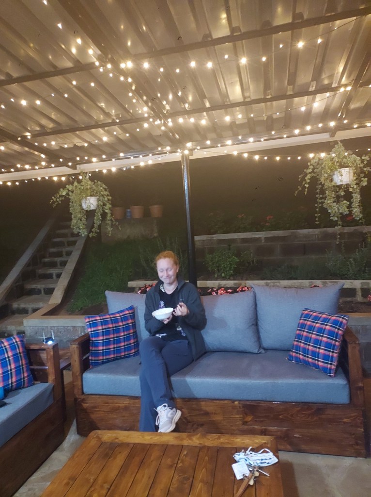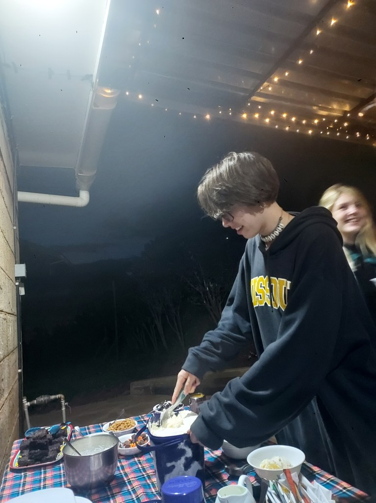 On my friends back porch with students under her twinkle lights